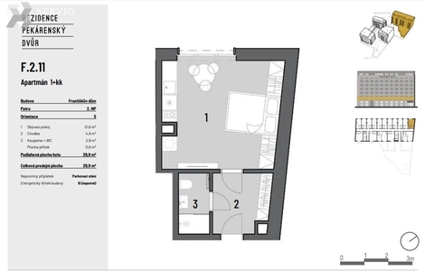 Hledáte bydlení v blízkosti centra města, se službami pětihvězdičkového hotelu, klubovým charakterem, pestrou nabídkou služeb výhradně pro rezidenty, umístěné v živém vnitrobloku plném zeleně? Pekárenský dvůr není jen bydlení, je to životní styl. Ten váš. Nabízíme k prodeji luxusní apartmán 2+kk o celkové ploše 40,1 m2, který je situovaný v 3.NP nově vybudovaného objektu Pekárenský dvůr. Dispozičně je apartmán řešen prostorným obývacím pokojem s kuchyňským koutem, ložnicí, koupelnou, toaletou a předsíní. Rozměry jednotlivých místností: obývací pokoj 19,6 m2, ložnice 11 m2, chodba/předsíň 5,5 m2, koupelna 4 m2, plocha příček 2,2 m2. Příslušenství za příplatek: sklepní kóje 1,7 m2 (povinný příplatek) 60.000 Kč vč. DPH, parkovací stání 750.000 Kč vč. DPH. V Pekárenském dvoře je k dispozici dalších 21 apartmánů o velikosti 2+kk s rozmezím celkové plochy 40,1 m2 až 63,1 m2, umístěných ve 2.NP až 6.NP. Dům dále nabízí jednotky o velikosti 1+kk, 3+kk a 6+kk. Některé z jednotek disponují balkonem, terasou nebo předzahrádkou. Pro všechny rezidenty je ale v areálu k dispozici i několik sdílených teras o celkové ploše 725 m2, uzpůsobených pro práci i trávení volného času. Pekárenský dvůr v Zábrdovicích patří díky blízkosti centra města a řadě služeb v okolí k nejlukrativnějším čtvrtím pro bydlení. Svými čistými liniemi a funkčním uspořádáním odkazuje architektura Pekárenského dvora na průmyslové stavby, které dodnes dotvářejí charakter brněnských Zábrdovic. Díky bohaté kulturní historii oblasti a zájmu investorů se tato lokalita rozvíjí ve velmi žádanou městskou čtvrť. Pulzující život centra moravské metropole se všemi jeho možnostmi máte jen deset minut chůze od domovního prahu. V těsném okolí Pekárenského dvora najdete řadu originálních podniků, kaváren a restaurací, jejichž návštěva vám zpříjemní každý den. Rezidence inspirovaná úspěšnými londýnskými projekty a splňující náročná environmentální kritéria pro certifikaci BREEAM. KRYTÁ GARÁŽOVÁ STÁNÍ Ve velkokapacitních garážích najdete nejen dobíjecí stanice pro elektromobily, samoobslužnou myčku, ale i kolárnu s prostorem na základní servis kol. ŠIROKÁ ŠKÁLA KLUBOVÝCH SLUŽEB Služby dostupné výhradně pro rezidenty a jejich hosty. Ty zahrnují například saunu, masérnu, fit centrum, 24/7 concierge službu a další. SEMIPRIVÁTNÍ PARK Parková úprava více než 2 600 m2 volné plochy vnitrobloku je dílem renomovaného zahradního ateliéru Krejčiříkovi, podepsaného např. pod návrhy zahrad vily Tugendhat či hospitalu Kuks. KVALITNÍ MATERIÁLY V materiálovém provedení interiérů držíme vysoký standard. Dřevěné podlahy, cihlové obklady fasád, moderní hliníková okna a dveře - to je kombinace pro nadčasově elegantní bydlení. Termín dokončení výstavby bytů je plánovaný ke konci roku 2023. Zajistíme Vám úspěšné financování koupě nemovitosti. Kupující neplatí provizi RK.