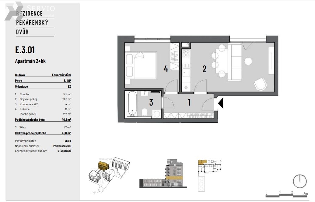 Hledáte bydlení v blízkosti centra města, se službami pětihvězdičkového hotelu, klubovým charakterem, pestrou nabídkou služeb výhradně pro rezidenty, umístěné v živém vnitrobloku plném zeleně? Pekárenský dvůr není jen bydlení, je to životní styl. Ten váš. Nabízíme k prodeji luxusní apartmán 2+kk o celkové ploše 40,1 m2, který je situovaný v 3.NP nově vybudovaného objektu Pekárenský dvůr. Dispozičně je apartmán řešen prostorným obývacím pokojem s kuchyňským koutem, ložnicí, koupelnou, toaletou a předsíní. Rozměry jednotlivých místností: obývací pokoj 19,6 m2, ložnice 11 m2, chodba/předsíň 5,5 m2, koupelna 4 m2, plocha příček 2,2 m2. Příslušenství za příplatek: sklepní kóje 1,7 m2 (povinný příplatek) 60.000 Kč vč. DPH, parkovací stání 750.000 Kč vč. DPH. V Pekárenském dvoře je k dispozici dalších 21 apartmánů o velikosti 2+kk s rozmezím celkové plochy 40,1 m2 až 63,1 m2, umístěných ve 2.NP až 6.NP. Dům dále nabízí jednotky o velikosti 1+kk, 3+kk a 6+kk. Některé z jednotek disponují balkonem, terasou nebo předzahrádkou. Pro všechny rezidenty je ale v areálu k dispozici i několik sdílených teras o celkové ploše 725 m2, uzpůsobených pro práci i trávení volného času. Pekárenský dvůr v Zábrdovicích patří díky blízkosti centra města a řadě služeb v okolí k nejlukrativnějším čtvrtím pro bydlení. Svými čistými liniemi a funkčním uspořádáním odkazuje architektura Pekárenského dvora na průmyslové stavby, které dodnes dotvářejí charakter brněnských Zábrdovic. Díky bohaté kulturní historii oblasti a zájmu investorů se tato lokalita rozvíjí ve velmi žádanou městskou čtvrť. Pulzující život centra moravské metropole se všemi jeho možnostmi máte jen deset minut chůze od domovního prahu. V těsném okolí Pekárenského dvora najdete řadu originálních podniků, kaváren a restaurací, jejichž návštěva vám zpříjemní každý den. Rezidence inspirovaná úspěšnými londýnskými projekty a splňující náročná environmentální kritéria pro certifikaci BREEAM. KRYTÁ GARÁŽOVÁ STÁNÍ Ve velkokapacitních garážích najdete nejen dobíjecí stanice pro elektromobily, samoobslužnou myčku, ale i kolárnu s prostorem na základní servis kol. ŠIROKÁ ŠKÁLA KLUBOVÝCH SLUŽEB Služby dostupné výhradně pro rezidenty a jejich hosty. Ty zahrnují například saunu, masérnu, fit centrum, 24/7 concierge službu a další. SEMIPRIVÁTNÍ PARK Parková úprava více než 2 600 m2 volné plochy vnitrobloku je dílem renomovaného zahradního ateliéru Krejčiříkovi, podepsaného např. pod návrhy zahrad vily Tugendhat či hospitalu Kuks. KVALITNÍ MATERIÁLY V materiálovém provedení interiérů držíme vysoký standard. Dřevěné podlahy, cihlové obklady fasád, moderní hliníková okna a dveře - to je kombinace pro nadčasově elegantní bydlení. Termín dokončení výstavby bytů je plánovaný ke konci roku 2023. Zajistíme Vám úspěšné financování koupě nemovitosti. Kupující neplatí provizi RK.