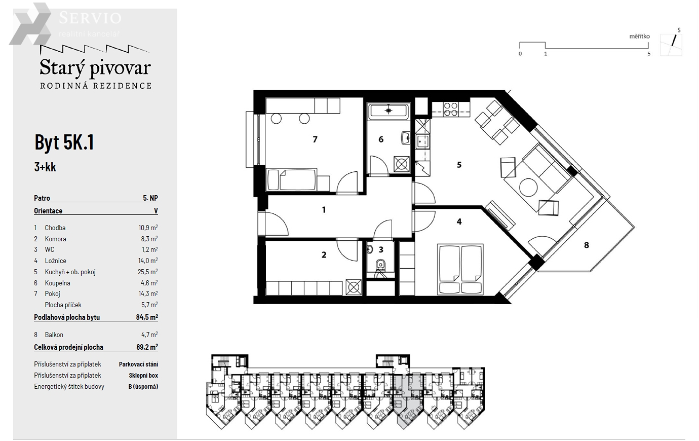 Nabízíme Vám promyšleně navrženou jednotku 3+kk, o celkové prodejní ploše 89,2 m2 (včetně 4,7 m2 balkonu), v Rodinné rezidenci Starý pivovar, který je jedinečným projektem v Králově Poli umístěný na klidném místě, stranou hlavních silničních tahů a v jedné z nejžádanějších brněnských lokalit. Architektura rezidence je navržena tak, aby co nejlépe odpovídala potřebám rodinného bydlení a udržela svoji architektonickou hodnotu po mnoho generací. Originálně je řešený návrh interiérů vůči světovým stranám tak, aby do interiérů pronikalo co nejvíce denního světla. Architektura domu klade důraz na maximální otevřenost interiérů, pracuje s vysoce kvalitními a nadčasovými materiály a zároveň odkazuje na historii místa. Jednotka nabízí velkorysé dispoziční řešení: obývací pokoj s kuchyní, dvě ložnice, sociální zařízení, prostornou komoru, chodbu a zádveří. Součástí rodinné rezidence Starý pivovar je 2.000 m2 parkové zeleně pro dětské hry a trávení volného času. V rezidenci Starý pivovar si můžete vybrat z posledních 9 jednotek o dispozicích 2kk, 3+kk i 4+kk, které disponují balkonem nebo terasou. K jednotkám náleží parkovací stání (za povinný příplatek) umístěné v 1. nadzemním podlaží. Jedná se o velmi ojedinělé bydlení v nejžádanější lukrativní lokalitě s výbornou dopravní obslužností i kompletní občanskou vybaveností, splňující veškeré podmínky k naplnění potřeb i těch nejnáročnějších klientů. Ihned k nastěhování. Pro více informací nás neváhejte kontaktovat.