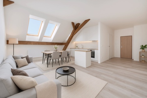 Pokud hledáte zcela nový byt s možností okamžitého nastěhování, mám pro vás skvělou příležitost. Nabízím podkrovní byt o celkové ploše 85,69 m2, který se nachází ve zrekonstruovaném historickém domě na ulici Hlavní v Oslavanech. Byt je světlý, prostorný a připravený pro nové majitele. Hlavní obytný prostor tvoří obývací pokoj s kuchyňským koutem o výměře 30,15 m2 - ideální místo pro společné chvíle i každodenní pohodlí. Kuchyňská linka není součástí prodeje, ale ráda pomohu s jejím návrhem a realizací podle vašich představ. Interiér oživují přiznané dřevěné trámy, které bytu dodávají jedinečný charakter, atmosféru a příjemný nádech historie. Soukromí a komfort zajišťují dva samostatné pokoje o velikostech 19,95 m2 a 19,38 m2 - vhodné jako ložnice, dětský pokoj nebo pracovna. Prostorná koupelna s vanou a WC nabízí pohodlí pro relaxaci i každodenní použití. K bytu náleží sklep o přibližné výměře cca 4 m2, aktuálně ve výstavbě. Parkování je možné v okolí domu. Velkou výhodou je vlastní plynová kotelna v domě, zajišťující efektivní vytápění Majitelé bytů mají navíc k dispozici společný uzavřený dvorek, ideální pro posezení, sušení prádla nebo bezpečný prostor pro děti. Školy a školky v blízkosti Základní škola Oslavany (Hlavní 43) - poskytuje kompletní výuku 1. i 2. stupně, nachází se jen 300 m od bytu (pár minut pěšky) Mateřská škola Duha (Sportovní 12) - má 4 třídy (3 běžné + 1 speciální), kapacitu až 89 dětí; je vzdálena cca 250 m (~4 min chůze) Okolní vybavenost Potraviny - cca 80 m (2 min pěšky) pediatr, obvodní lékaři, zubaři, lékárna vše u autobusového nádraží - cca 240 m (3 min pěšky) V Oslavanech najdete i: Biotop u zámku.Přírodní koupací biotop se nachází cca 140 m od domu, v zámeckém parku. Nabízí koupání v čisté vodě, dětské hřiště, venkovní fitness a občerstvení - ideální pro relaxaci i rodinné chvíle. Permonium - zábavní park. Areál postavený v bývalém dolu Kukla je vzdálen přibližně 1,4 km (cca 15 min chůze). Nabízí lanové aktivity, tematické expozice, interaktivní hru i vzdělávání o hornictví a historii. Dojezdové vzdálenosti Brno: cca 25-30 km (autem nebo autobusem do 30 min) Rosice: cca 8 km (10 min autem) Proč právě tento byt? Nemusíte nic rekonstruovat - stačí se nastěhovat a začít si užívat nový domov. Ozvěte se mi pro více informací nebo domluvení prohlídky - těším se na vás!