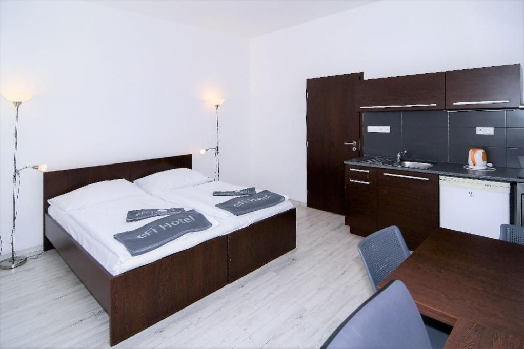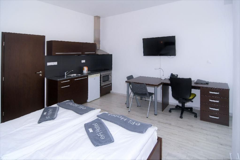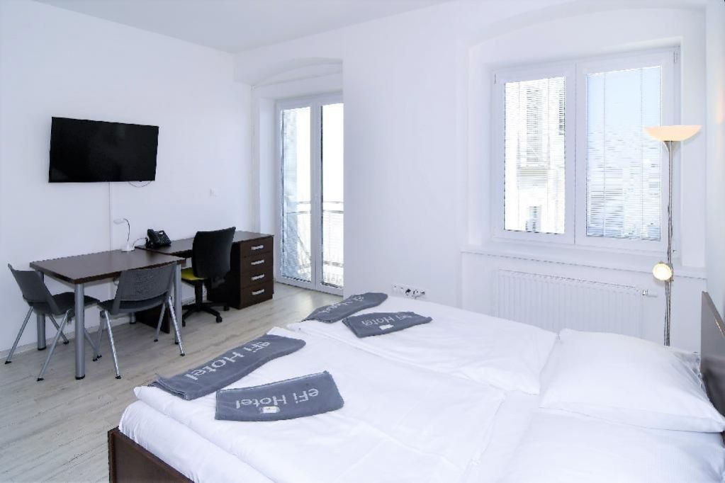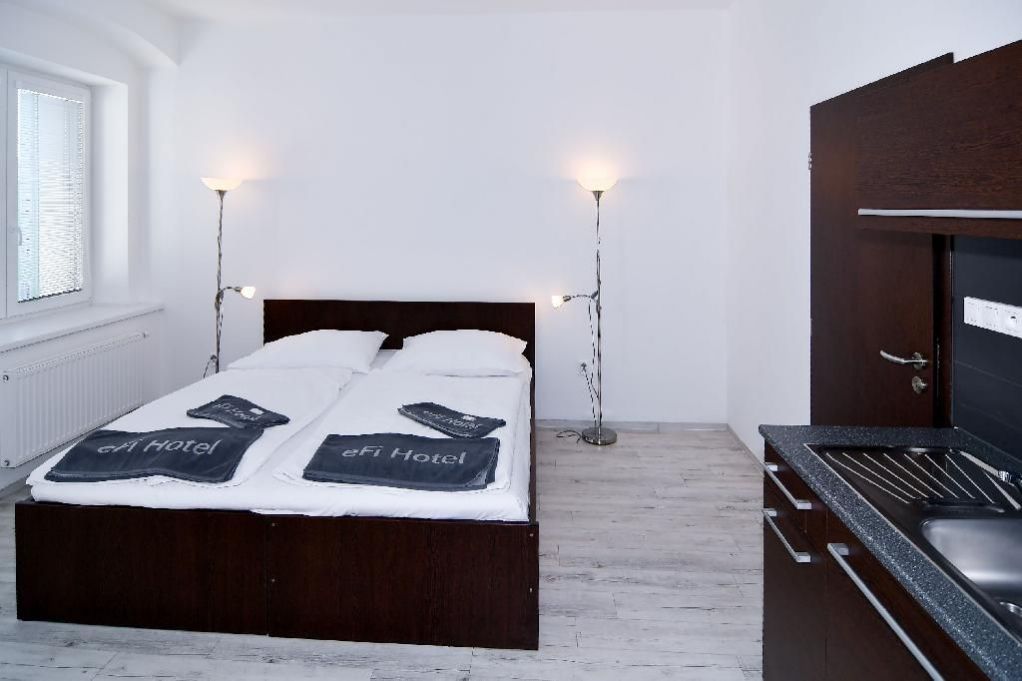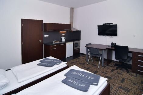Kompletně zařízený byt. Pronájem na dobu od jednoho měsíce. Možnost pronájmu parkovacího místa za 46 EUR. Možnost pronájmu pračky za 23 EUR. V případě pronájmu firmě, možnost odpočtu DPH. Pro studijní i pracovní pobyty nabízíme pronájem plně zařízeného bytu 1+kk včetně kuchyňské linky a elektrospotřebičů v hotelovém komplexu eFi Palace Hotel v centru Brna. V rámci uzavřeného hotelového komplexu Vám bude k dispozici také fitness, wellness, restaurace, venkovní bazén a parkování na hlídaném parkovišti. Pronájem bytu je možný již od jednoho měsíce až po dobu několika let. Nájemcem může být fyzická osoba či firma. Plátci daně mohou využít odečtu DPH. Odjíždíte na léto domů? Nevadí, byt uvolníte na letní období, ve kterém nebudete nic platit, a od podzimu se můžete znovu nastěhovat do stejného bytu. Byty 1+kk jsou o výměře od 26,41 do 29,71 m2 a nacházejí se ve 2.-5. podlaží. Budova je opatřena výtahem i schodištěm. Byt má vstupní chodbu vybavenou vysokou šatní skříní s celoplošným zrcadlem a pokojovým trezorem. Dále byt disponuje obývací částí s komfortními postelemi 90 x 200 cm, moderní vybavenou kuchyňskou linkou s pracovní deskou, podstavnou lednicí indesit, vestavěnou mikrovlnou trouba s grilem a horkovzdušnou troubou, varnou konvicí a jídelní soupravou s nádobím pro 2 osoby. Pokoj je vybavený jídelním stolem se 2 židlemi, pracovním stolem s kancelářskou židlí a smart TV. Koupelna je s buď s vanou, nebo sprchovým koutem, umyvadlem, wc a topným žebříkem. WiFi připojení se standardní rychlostí dat je již v ceně pronájmu. V ceně měsíčního nájmu je kalkulována paušálně i cena za odběr elektřiny, vody a topení. Cena měsíčního nájmu zahrnuje úklid společných prostor a pronájem povlečení s jejich výměnou v rozsahu dvakrát měsíčně. Možnost pronájmu parkovacího stání v areálu komplexu je za 46 EUR měsíčně. Možnost pronájmu pračky umístěné v bytě za 23 EUR Kč měsíčně. Je požadovaná vratná kauce ve výši jednoho až dvou nájmů dle délky ubytování. Dlouhodobě ubytovaní nájemci mají v komplexu eFi Palace Hotelu zvýhodněný vstup do hotelového wellness a fitness centra, slevu 5 % v hotelové restauraci Stará Tkalcovna včetně možnosti nákupu zvýhodněných snídaní. Nabídka je vhodná pro pracovní či studijní pobyty, a to zejména pro oborové specialisty, vytížené vedoucí pracovníky, obchodní zástupce, podnikatelé či studenty vysokých škol. Skvělá dostupnost do centra Brna za necelých 10 minut pěší chůze nebo dvě zastávky MHD. Více informací na: www.efipalace.cz. Prohlídky bytů možné kdykoli po předchozí domluvě. Neplatíte provizi za zprostředkování pronájmu! <a href="https://www.eurobydleni.cz/byty/3_kk/brno/obec-zabrdovice/pronajem/"><strong>Pronájem bytu 3+kk Brno-město, Zábrdovice</strong></a>