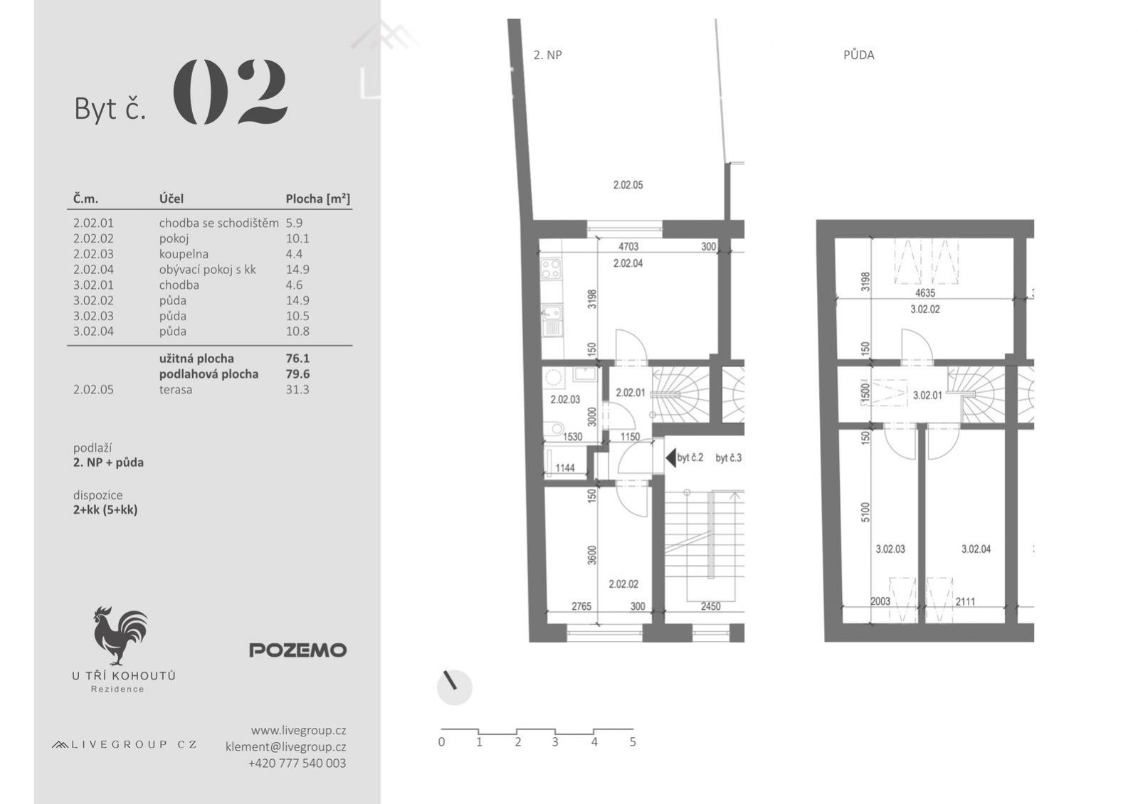 Nová rezidence U tří kohoutů v Ivančicích nabízí 5 nových bytových jednotek. Projekt U tří kohoutů nabízí stylový byt č. 2 - 5+kk o ploše 79,6 m. Nachází se v centru Ivančic u Brna a nabízí moderní bydlení v příjemném prostředí. Největším benefitem je prostorný obytný prostor s kuchyňským koutem a přímým vstupem na sever orientovanou terasu o velikosti 31,3 m, která poskytuje ideální místo k relaxaci. Dispozici dále tvoří vstupní chodba s místem pro úložné prvky, ložnice a koupelna se sprchovým koutem. Komfort doplňuje skladovací kóje a možnost krytého venkovního parkování ve vnitrobloku v hodnotě 400.000,- Kč. Projekt U tří kohoutů představuje nový standard bydlení. Spojuje moderní architekturu a špičkové technologie s důrazem na udržitelnost. Nabízí širokou škálu bytů od 2+kk, 4+kk až po prostorné 5+kk s balkónem, terasou nebo zahrádkou. Moderní technologie zahrnují retenční nádrže, multisplitové jednotky (tepelná čerpadla) a přípravu pro instalaci fotovoltaických panelů, které dohromady zajišťují energetickou úspornost a zvyšují komfort bydlení. Rezidence U tří kohoutů je vhodná pro všechny generace. Vnitroblok je obklopen zelení, v blízkém okolí s dětskými hřišti, sportovišti a cyklostezkou. Okolní prostředí láká k aktivnímu odpočinku aktivitami v těsné blízkosti komplexu. Veškerá občanská vybavenost poskytuje potřebné služby, což činí z rezidence ideální místo pro moderní život. Byt bude dokončen ve vysokém standardu, jakou jsou vinylové podlahy, velkoformátové obklady, vybavení koupelen značky Laufen a Hansgrohe, bezpečnostní vstupní dveře nebo plastová okna s izolačními trojskly venkovními žaluziemi na elektrické ovládání. Podlahové elektrické vytápění a chlazení udržují ideální teplotu v každé místnosti po celý rok. U bytu č. 1 a 2 bude rekuperace, která zajišťuje kontrolované větrání a přívod čerstvého vzduchu. Ivančice je klidné a malebné město, které skvěle kombinuje blízkost k přírodě s městskou vybaveností. Je známé svými historickými památkami i rozsáhlými přírodními oblastmi, včetně přírodního parku Bobrava a Střední Pojihlaví, přírodních památek Bouchal, Pekárka i Budkovické slepence. Pro rodiny i jednotlivce je dostupná kompletní občanská vybavenost včetně škol, školek, obchodů a sportovních zařízení. V Ivančicích se také nachází okresní nemocnice. Díky vynikající dopravní, silniční dostupnosti jsou okolní města i dálniční síť snadno dostupné. Cesta autem do Brna trvá asi 30 minut, zatímco pravidelným autobusovým spojením se dostanete za 40 minut. Ivančice jsou tak ideálním místem pro ty, kdo hledají klidné bydlení s rychlým přístupem k městským výhodám. Pro více informací nás neváhejte kontaktovat - LIVEGROUP CZ <a href="https://www.eurobydleni.cz/byty/2_kk/brno-venkov/obec-ivancice/prodej/"><strong>Prodej bytu 2+kk Ivančice</strong></a>