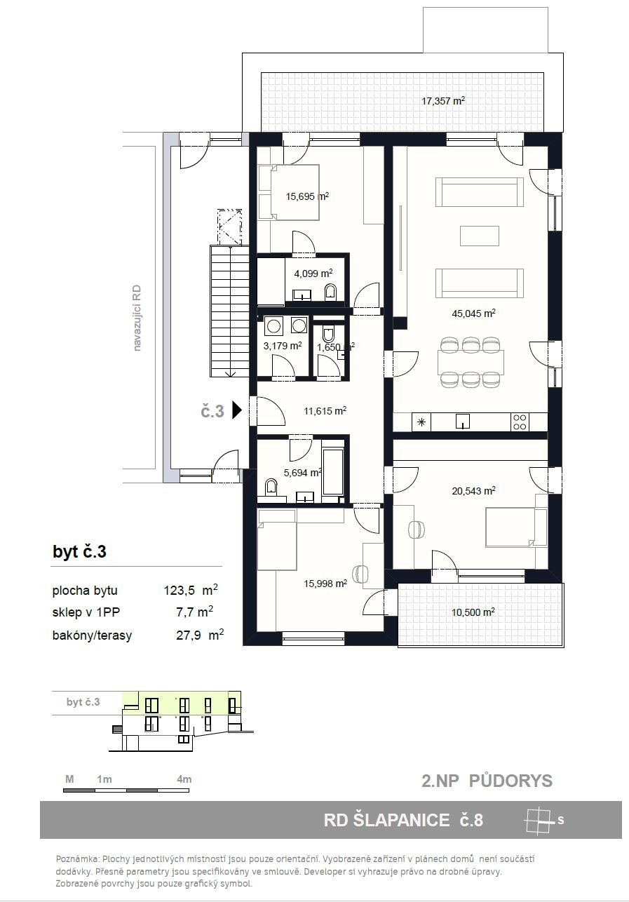 V rámci projektu Nové Šlapanice, který vyrůstá na okraji města Šlapanic si Vám dovolujeme představit výjimečné a na danou lokalitu ojedinělé bydlení. Představujeme Vám 3.etapu, která je zaměřena na výstavbu 4 viladomů, se 3 bytovými jednotkami a ateliérem. Je to ideální místo pro ty, kteří hledají kvalitní, moderní, prostorné a dispozičně chytře řešené bydlení. V tomto projektu nabízíme k prodeji byt 4+KK s terasou 17,35m2, balkonem 10,5m2, sklepem 7,7m2 a 1 parkovacím stáním, vše je součástí kupní ceny. Možnost dokoupení dalšího parkovacího stání za cenu 300.000,-Kč. První tři kupující v tomto projektu mají BONUS - KUCHYŃSKOU LINKU VČETNĚ VŠECH SPOTŘEBIČŮ Zn. ELECTROLUX V HODNOTĚ 650.000,-Kč ZDARMA. V celém bytě jsou venkovní žaluzie. Viladům č.7 na ulici Stanislava Hanzelky Byt č.3 o celkové ploše je umístěn v 2.NP Dispozice: chodba 11,61m2, obývací pokoj s kuchyňským koutem 45,04m2, ložnice 15,69m2 s koupelnou s vanou včetně WC 4,09m2, dětský pokoj 20,54m2 a druhý dětský pokoj 15,99m2 se vstupy na balkon 10,5m2, koupelna s vanou včetně WC 5,69m2, technická místnost 3,17m2 a WC zvlášť 1,65m2. Z obývacího pokoje a ložnice je vstup na terasu o výměře 17,35m2. Standarty bytu, které jsou součástí kupní ceny: - podlahy vinyl, keramická dlažba - sanitární technika, 2x umyvadlo včetně baterie, 2x vana, 3 x závěsné WC, zrcadla, obklady - mramor - interiérové dveře + obložkové zárubně, vstupní dveře - podlahové vytápění, topné těleso - venkovní světla - klimatizace - rekuperace Samotná lokalita nabízí širokou škálu pracovních možností a veškerou potřebnou občanskou vybavenost a výbornou dojezdnost díky dálnici D1 a D2. Také zde v docházkové vzdálenosti nalezneme školu, školku, řadu obchodů, restaurací a služeb, trolejbusovou zastávku, ale především vlakové nádraží, z kterého jste na Hlavním vlakovém nádraží v Brně va 15 min. Dokončení bytů je plánované na 3Q roku 2026. Výhodou je model financování nemovitosti. Pokud by Vás nabídka tohoto či jakéhokoliv jiného bytu v tomto projektu zaujala, kontaktujte prosím makléře, u kterého se dozvíte více. Děláme moderní bydlení dostupnější.