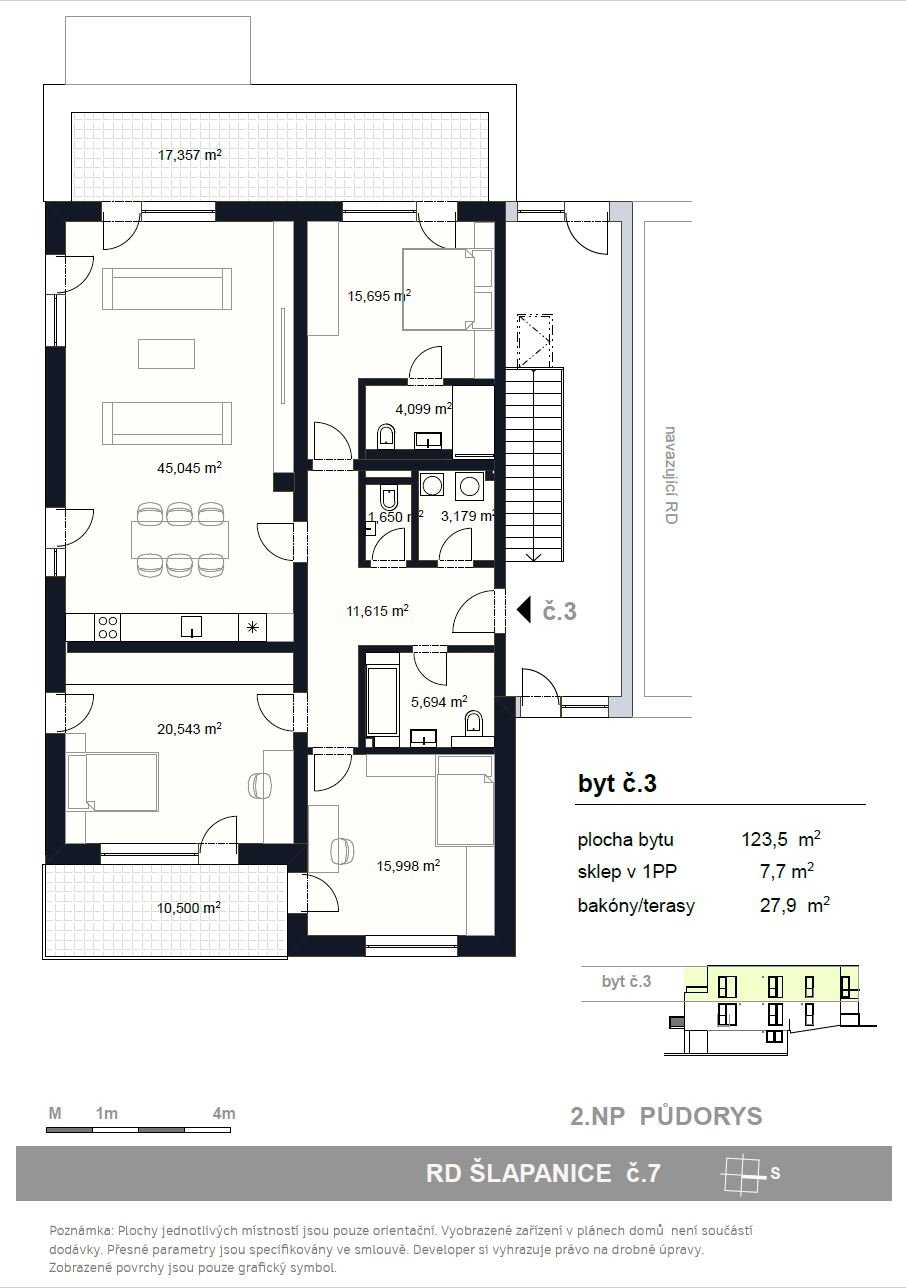 V rámci projektu Nové Šlapanice, který vyrůstá na okraji města Šlapanic si Vám dovolujeme představit výjimečné a na danou lokalitu ojedinělé bydlení. Představujeme Vám 3.etapu, která je zaměřena na výstavbu 4 viladomů, se 3 bytovými jednotkami a ateliérem. Je to ideální místo pro ty, kteří hledají kvalitní, moderní, prostorné a dispozičně chytře řešené bydlení. V tomto projektu nabízíme k prodeji byt 4+KK s terasou 18m2, balkonem 10,5m2, sklepem 7,7m2 a 1 parkovacím stáním vše je součástí kupní ceny. Možnost dokoupení dalšího parkovacího stání za cenu 300.000,-Kč. První tři kupující v tomto projektu mají BONUS - KUCHYŃSKOU LINKU VČETNĚ VŠECH SPOTŘEBIČŮ Zn. ELECTROLUX V HODNOTĚ 650.000,-Kč ZDARMA. V celém bytě jsou venkovní žaluzie Viladům č.7 na ulic Stanislava Hanzelky Byt č.3 o celkové ploše je umístěn v 2.NP Dispozice: chodba 11,61m2, obývací pokoj s kuchyňským koutem 45,04m2, ložnice 15,69m2 s koupelnou s vanou včetně WC 4,09m2, dětský pokoj 20,54m2 se vstupem na balkon 10,5m2, druhý dětský pokoj 15,99 m2, koupelna s vanou včetně WC 5,69m2, technická místnost 3,17m2 a WC zvlášť 1,65m2. Z obývacího pokoje a ložnice je vstup na terasu o výměře 18m2. Standarty bytu, které jsou součástí kupní ceny: - podlahy vinyl, keramická dlažba - sanitární technika, 2x umyvadlo včetně baterie, 2x vana, 3 x závěsné WC, zrcadla, obklady - mramor - interiérové dveře + obložkové zárubně, vstupní dveře - podlahové vytápění, topné těleso - venkovní osvětlení - klimatizace - rekuperace Samotná lokalita nabízí širokou škálu pracovních možností a veškerou potřebnou občanskou vybavenost a výbornou dojezdnost díky dálnici D1 a D2. Také zde v docházkové vzdálenosti nalezneme školu, školku, řadu obchodů, restaurací a služeb, trolejbusovou zastávku, ale především vlakové nádraží, z kterého jste na Hlavním vlakovém nádraží v Brně va 15 min. Dokončení bytů je plánované na 3Q roku 2026. Výhodou je model financování nemovitosti. Pokud by Vás nabídka tohoto či jakéhokoliv jiného bytu v tomto projektu zaujala, kontaktujte prosím makléře, u kterého se dozvíte více. Děláme moderní bydlení dostupnější.