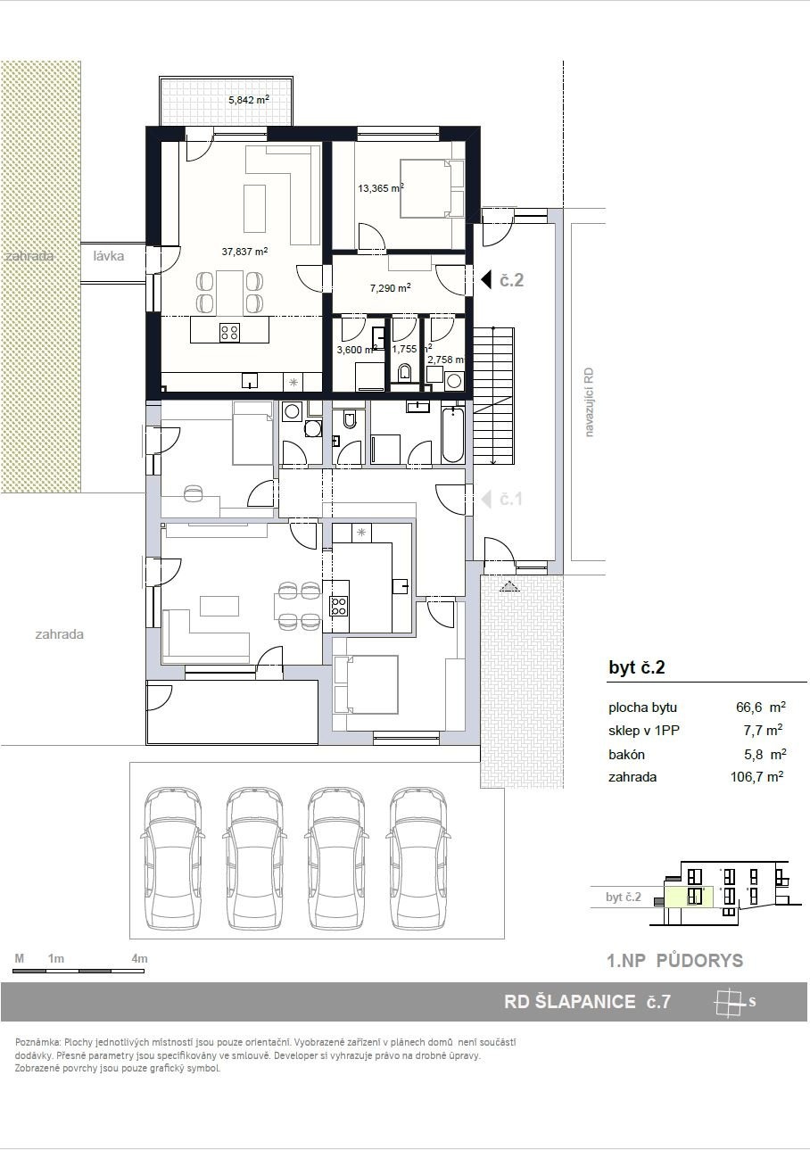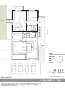 V rámci projektu Nové Šlapanice, který vyrůstá na začátku Šlapanic si Vám dovolujeme představit výjimečné a na danou lokalitu ojedinělé bydlení. Celý projekt je v nadstandartním provedení. Představujeme Vám 3.etapu, která je zaměřena na výstavbu 4 viladomů. Každý viladům má 3 bytové jednotky a ateliér Je to ideální místo pro ty, kteří hledají kvalitní, moderní, prostorné a dispozičně chytře řešené bydlení. V tomto projektu nabízíme k prodeji byt 2+KK s balkonem 5,8m2, zahradou 106,7m2, sklepem 7,7m2 a 1 parkovacím stáním vše je součástí kupní ceny. Možnost dokoupení dalšího parkovacího stání za 300.000,-Kč První tři kupující v tomto projektu mají BONUS - KUCHYŃSKOU LINKU VČETNĚ VŠECH SPOTŘEBIČŮ Zn. ELECTROLUX V HODNOTĚ 650.000,-Kč ZDARMA. V celém bytě jsou venkovní žaluzie. Viladům 7 na ulici Stanislava Hanzla Byt č.2 je umístěn v 1.NP Dispozice: chodba 7,29m2, obývací pokoj s kuchyňským koutem 37,83m2 s přímým vstupem přes lávku na zahradu 106,7m2 a s balkonem 5,8m2, ložnice 13,36m2, koupelna se sprchovým koutem 3,6m2 a WC zvlášť 1,75m2 a technická místnost 2,75m2. Standarty bytu, které jsou součástí kupní ceny: - podlahy vinyl, keramická dlažba - sanitární technika, sprchový kout, včetně sprchového setu, umyvadlo včetně baterie, vana, závěsné WC, zrcadlo, obklady -mramor - interiérové dveře + obložkové zárubně, vstupní dveře - podlahové vytápění, topné těleso - klimatizace - venkovní osvětlení - rekuperace Samotná lokalita nabízí širokou škálu pracovních možností a veškerou potřebnou občanskou vybavenost a výbornou dojezdnost díky dálnici D1 a D2. Také zde v docházkové vzdálenosti nalezneme školu, školku, řadu obchodů, restaurací a služeb, trolejbusovou zastávku, ale především vlakové nádraží, z kterého jste na Hlavním vlakovém nádraží v Brně za 15 min. Dokončení bytů je plánované na 3Q roku 2026. Výhodou je model financování nemovitosti. Pokud by Vás nabídka tohoto či jakéhokoliv jiného bytu v tomto projektu zaujala, kontaktujte prosím makléře, u kterého se dozvíte více. Děláme moderní bydlení dostupnější.