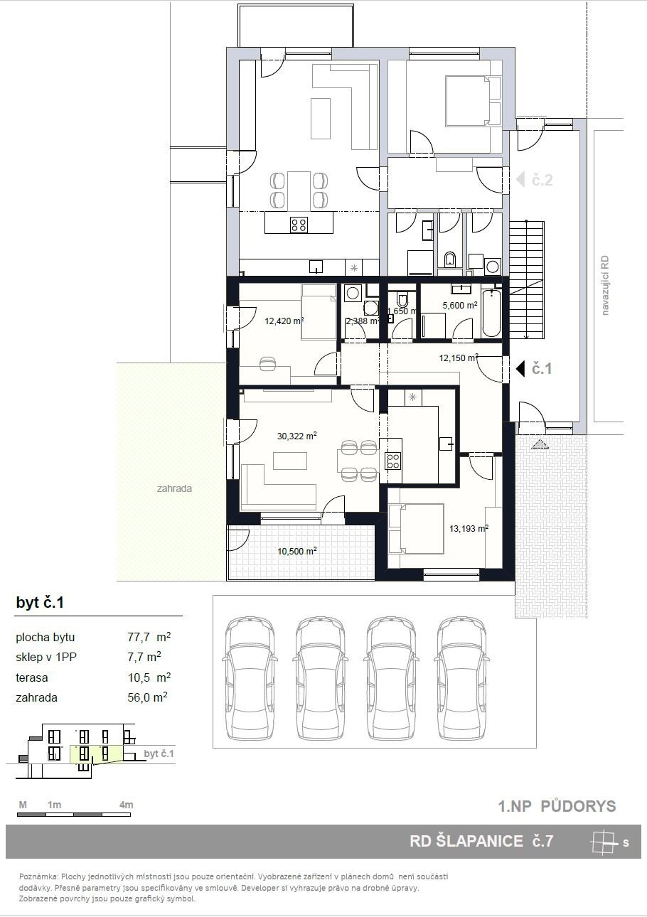 V rámci projektu Nové Šlapanice, který vyrůstá na začátku Šlapanic si Vám dovolujeme představit výjimečné a na danou lokalitu ojedinělé bydlení. Celý projekt je v nadstandartním provedení. Představujeme Vám 3.etapu, která je zaměřena na výstavbu viladomů. V každém viladomě jsou 3 bytové jednotky a ateliér. Je to ideální místo pro ty, kteří hledají kvalitní, moderní, prostorné a dispozičně chytře řešené bydlení. Nabízíme k prodeji byt 3+KK s terasou 10,5m2, zahradou 56m2, sklepem 7,7m2 a 1 parkovacím stáním, vše je součástí kupní ceny. Možnost dokoupení dalšího parkovacího stání za 300.000,-Kč První tři kupující v tomto projektu mají BONUS - KUCHYŃSKOU LINKU VČETNĚ VŠECH SPOTŘEBIČŮ Zn. ELECTROLUX V HODNOTĚ 650.000,-Kč ZDARMA. V celém bytě jsou venkovní žaluzie. Viladum č.7 na ulici Stanislava Hanzelky Byt č.1 je umístěn v 1.NP Dispozice: chodba 12,42m2, obývací pokoj s kuchyňským koutem 30,3m2 s přímým vstupem na terasu 10,5m2 a zahradu 56m2, ložnice 13,19m2, dětský pokoj 12,42m2, koupelna s vanou a sprchovým koutem 5,6m2, WC zvlášť 1,65m2. a technickou místností 2,38m2. Standarty bytu, které jsou součástí kupní ceny: - podlahy vinyl, keramická dlažba - sanitární technika, sprchový kout, včetně sprchového setu, umyvadlo včetně baterie, vana, závěsné WC, zrcadlo, obklady - mramor - interiérové dveře + obložkové zárubně, vstupní dveře - podlahové vytápění, topné těleso - klimatizace - venkovní osvětlení - rekuperace Samotná lokalita nabízí širokou škálu pracovních možností a veškerou potřebnou občanskou vybavenost a výbornou dojezdnost díky dálnici D1 a D2. Také zde v docházkové vzdálenosti nalezneme školu, školku, řadu obchodů, restaurací a služeb, trolejbusovou zastávku, ale především vlakové nádraží, z kterého jste na Hlavním vlakovém nádraží v Brně za 15 min. Dokončení bytů je plánované na 3Q roku 2026. Výhodou je model financování nemovitosti. Pokud by Vás nabídka tohoto či jakéhokoliv jiného bytu v tomto projektu zaujala, kontaktujte prosím makléře, u kterého se dozvíte více. Děláme moderní bydlení dostupnější.