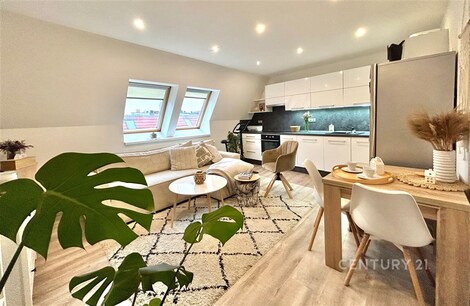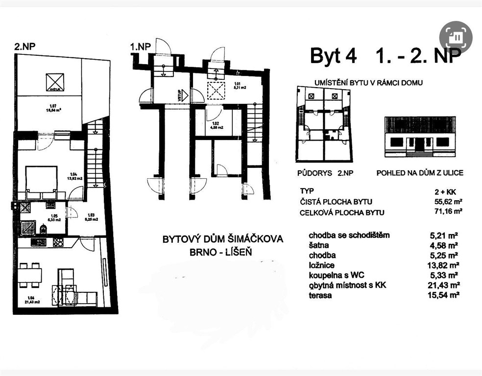 Nabízíme Vám k pronájmu útulný byt o dispozici 2+kk v lokalitě Brno - Líšeň, na ulici Šimáčkova. Tento byt má užitnou plochu 56 m2, nachází se v 1. a 2. NP. Celková plocha bytu zahrnuje obývací pokoj s kuchyňským koutem (21 m2), který je vybaven linkou se spotřebiči (elektrická trouba s indukční deskou, digestoř, mikrovlnná trouba, vestavná myčka), ložnici (14 m2) a koupelnu se sprchovým koutem s WC (5 m2), prostornou chodbu se schodištěm (5 m2), chodbu (5 m2) a šatnu (5 m2). K bytu náleží terasa (16 m2) a sklep. Možnost připojení k internetu. Nájemné/měsíc: 18 900 Kč + zálohy na služby 4 000 Kč (energie, voda, teplo). Vratná jistina: 20 000 Kč. Provize RK: 18 900 Kč. V okolí domu je veškerá občanská vybavenost, zastávka MHD v blízkosti. Byt je volný od února 2026.