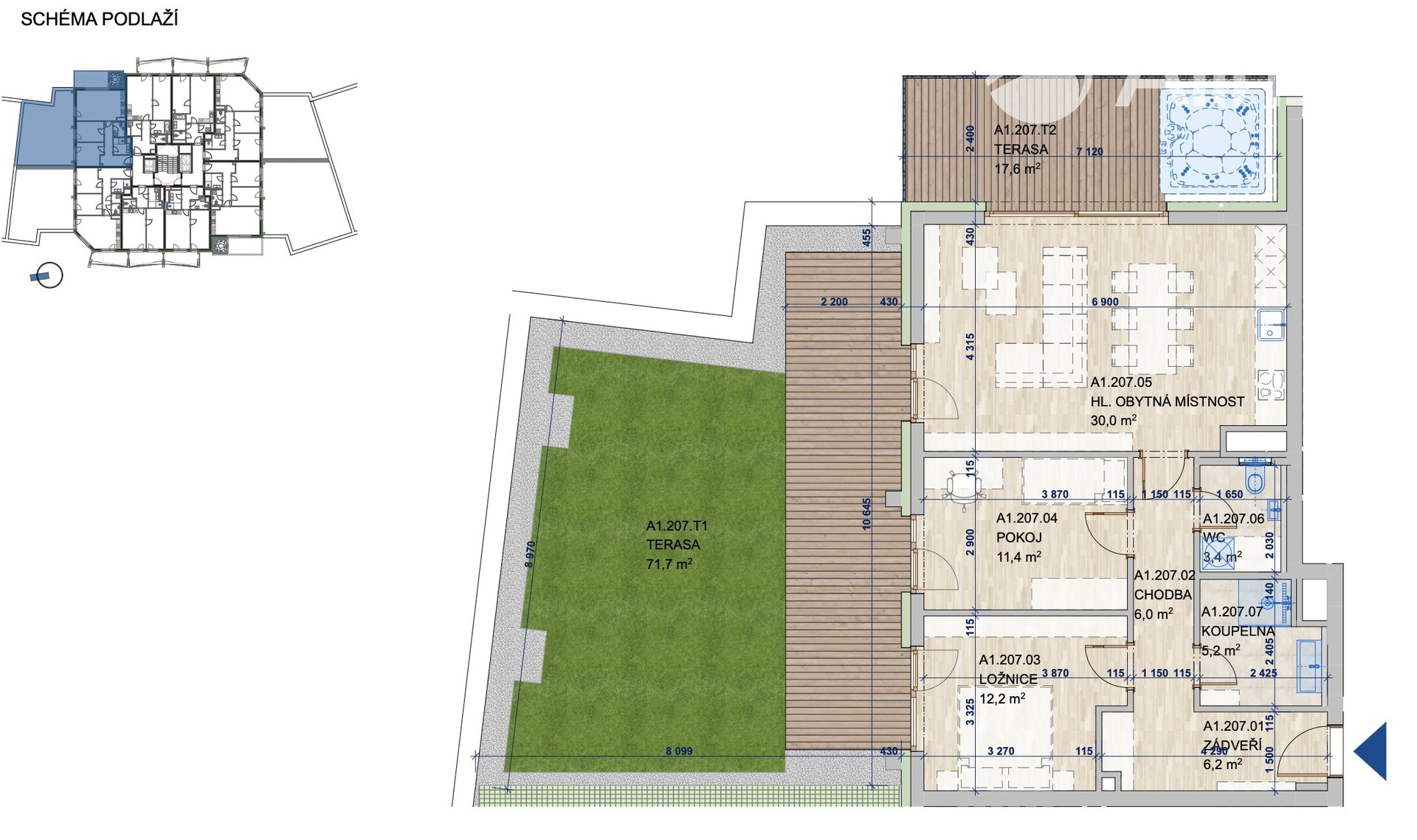 Bydlete v brněnském diamantu. Polyfunkční objekt Allrisk MERIDIEM nabízí moderní byty rozmanitých dispozic a metráží v lokalitě nově vznikající jižní čtvrti Trnitá vzdálené jen 5 minut od centra Brna. V Allrisk MERIDIEM se potkává městský život s prostorem pro relax, sport a každodenní pohodlí. Žijte na adrese, která spojuje centrum města i budoucnost výjimečné lokality. Služby v domě: * posilovna * kavárna Kafec * vinotéka * jógové studio * kosmetické služby * pobočka Allrisk reality & finance V rámci projektu nabízíme byt 3+kk o celkové ploše 77,2 m2, umístěný ve 2. nadzemním podlaží. Součástí bytu je terasa a zahrada o celkové výměře 72 m2, která je přístupná z hlavní obytné místnosti i z ložnice a dalšího pokoje. Dispozice bytu zahrnuje zádveří s možností úložných řešení, koupelnu se sprchovým koutem, samostatné WC, oddělená místnost pro pračku a hlavní obytnou místnost s kuchyňským koutem, ložnici a další pokoj. Byt je řešen s přímým propojením interiéru a venkovní části. Možnost dokoupení garážového stání a sklepní kóje za výhodnou cenu. Zaujala vás nabídka? Vyplňte kontaktní formulář nebo navštivte webové stránky projektu. Rádi vám celý projekt představíme v prezentační místnosti přímo u stavby. Financování k rezervaci stačí pouze 3 % z kupní ceny, zbývajících 97 % se hradí až po podpisu kupní smlouvy. S financováním i případným pronájmem Vám ráda pomůže skupina Allrisk, která nabízí širokou paletu produktů a služeb. Pokud jste si nevybrali z uveřejněné nabídky, zadejte nám prosím Vaši poptávku a my se pokusíme najít odpovídající nemovitost.