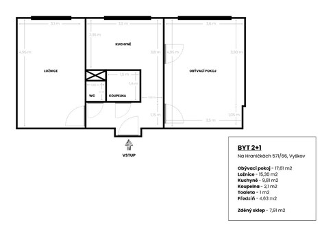 Léty prověřená dispozice, cihlový bytový dům, nízké měsíční náklady a nadstandardní úložný prostor… To jsou hlavní přívlastky, které nejlépe vystihují právě tento byt o dispozici 2+1, který je umístěný v cihlovém bytovém domě na ulici Na Hraničkách ve Vyškově. Byt je umístěn ve třetím nadzemním podlaží (2. patře) z celkem tří nadzemních podlaží bytového domu bez výtahu. Samotný byt disponuje plochou 50,45 m2. K tomu dále patří zděný sklep umístěný v prvním podzemním podlaží s plochou 7,91 m2. Byt je v původním stavu po dílčích modernizacích. Bytové jádro je umakartové. Elektrorozvody, rozvody vody a odpadů v bytě jsou původní. Poslední modernizací v bytě jsou vinylové podlahy, které jsou položeny ve všech místnostech. Navíc je byt opatřen bezpečnostními vstupními dveřmi. Kuchyně je vybavena kuchyňskou linkou s elektrickou varnou deskou, elektrickou troubou a digestoří. Dispozice bytu se skládá ze vstupní chodby, dvou pokojů, kuchyně, koupelny s vanou a oddělené toalety. Jednou z hlavních výhod bytu jsou bezesporu dva prostorné neprůchozí pokoje, díky kterým je efektivně využita celková plocha. Centrální bytové jádro s kuchyní pak nabízí možnost snadné úpravy dispozice při případné rekonstrukci. Díky orientaci na jihovýchod je byt zároveň dostatečně světlý. Topení a ohřev vody je zajištěno centrálně dálkově. Dle aktuálního předpisu plateb činí platby spojené s bytem celkem 3.964 Kč měsíčně včetně fondu oprav. Zálohové platby se skládají z 850 Kč elektřina, 700 Kč teplo, 340 Kč teplá voda, 200 Kč studená voda, 1.329 Kč příspěvek do fondu oprav, 545 Kč ostatní náklady. Byt, který dává smysl dnes a zároveň nabízí prostor pro vlastní vizi do budoucna - a právě v tom spočívá jeho největší hodnota. Ať už hledáte první bydlení, klidné místo pro život, nebo investici s potenciálem dalšího zhodnocení, tady můžete začít. Zavolejte mi a domluvte si prohlídku - byt je k dispozici ihned.