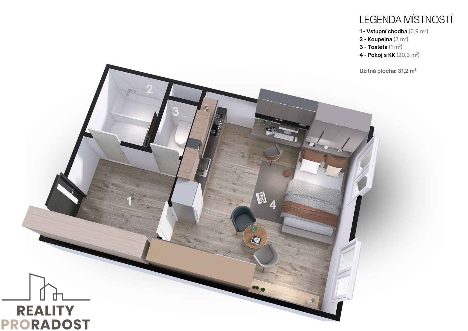 V zastoupení majitele nabízíme k prodeji byt o dispozici 1+kk v městské části Brno-Bohunice, ulice Havelkova. Nabízený byt má výměru 31,2m2 a je situován v 6. podlaží ve 12 podlažním panelovém domě s novým výtahem. Do bytu se vstupuje předsíní(6,9m2) s místem na úložné prostory. Odtud lze pokračovat do koupelny(3m2), na WC(1m2) a pokoje(20,3m2) s kuchyňským koutem. Jádro je zděné. Ve vstupní chodbě, koupelně, toaletě a kuchyňském koutě je keramická dlažba, v pokoji plovoucí laminátová podlaha. Ohřev vody a vytápění je dálkové pro celý dům. Měsíční zálohy placené správě domu vychází na 3.600Kč/Měs (fond oprav, teplo, teplá voda, vodné a stočné, ...) K bytu náleží sklepní kóje o výměře cca 1,5m2. Ze společných prostor v domě lze využívat v patře společný úložný prostor pro to dané patro(kočárkárna) a sušárnu v suterénu. Parkování je na ulici u domu a přilehlých parkovištích. V okolí domu je kompletní občanská vybavenost - MŠ, ZŠ, dětská hřiště, Úřad měst. části, Fakultní nemocnice, Sokolovna, Orlovna, tenisové kurty, venkovní koupaliště, Obchodní centrum Campus Square, Albert, Lidl, Kaufland, Billa, Tesco. Dopravní dostupnost MHD a IDS. Zastávka Běloruská pro tramvaje a autobusy je vzdálena 250m od domu. Pro více informací, zájmu o prohlídku nebo v případě nejasností volejte níže uvedeného makléře.