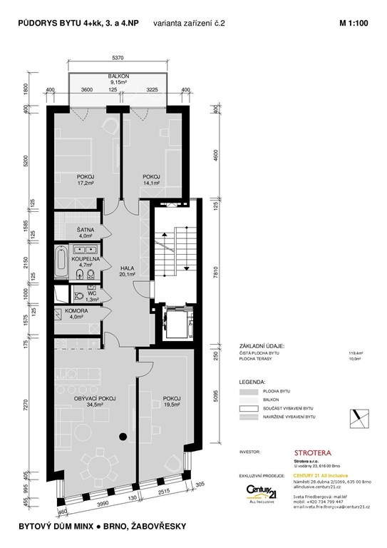 Prostor, světlo, komfort, krásný výhled z celého bytu, moderní architektura? Vše v jednom v Žabovřeskách. Jedinečná příležitost pronájmu bytu v Brně v Žabovřeskách o dispozici 4+KK a celkové ploše 129 m2. Prostorný, světlý byt o vnitřní podlahové ploše 120m2 s balkonem 9 m2 je orientován do klidného vnitrobloku do zahrad, nabízí uživatelům výhled na vzrostlé stromy. Parkování přímo v domě v zakladačích. Společným jmenovatelem celého bytového domu je mimořádné soukromí a velkorysý obytný prostor (na každém patře je pouze jeden byt), komfort (bezbariérový přístup výtahem až do bytu, parkování v domě) a světlo (dřevěná francouzská okna se skleněným zábradlím, speciální akustické ventilační mřížky do ulice). Špičkové standardy vybavení interiéru domu a bytu travertinový obklad vstupní haly, dřevěné dubové podlahy, dýhované dveře, s nerezovými klikami, koupelna s dvojumyvadlem a bidetem, podlahové topení s vlastním kotlem. Lokalita bytového domu je v oblíbené a vyhledávané čtvrti Brna "staré Žabovřesky", nedaleko od centra města. V těsné blízkosti se nachází například Wilsonův les a sportovní areál Rosnička, ale také jedna z nejlepších základních škol města - ZŠ Sirotkova a elitní Gymnázium Matyáše Lercha. Autor projektu, prof. Ing. arch. Petr Pelčák, klade nebývalý důraz na kvalitní provedení a architekturu nejen domu jako celku, ale i řešením detailů interiérů. Cena podnájmu je 35.000, za byt, 2.000, za parkování. K ceně nájemného budou připočteny zálohy na služby ve výši 6.000, korun. Pro sjednání prohlídky Vašeho nového bydlení bez kompromisů kontaktujte makléřku. Volné ihned.