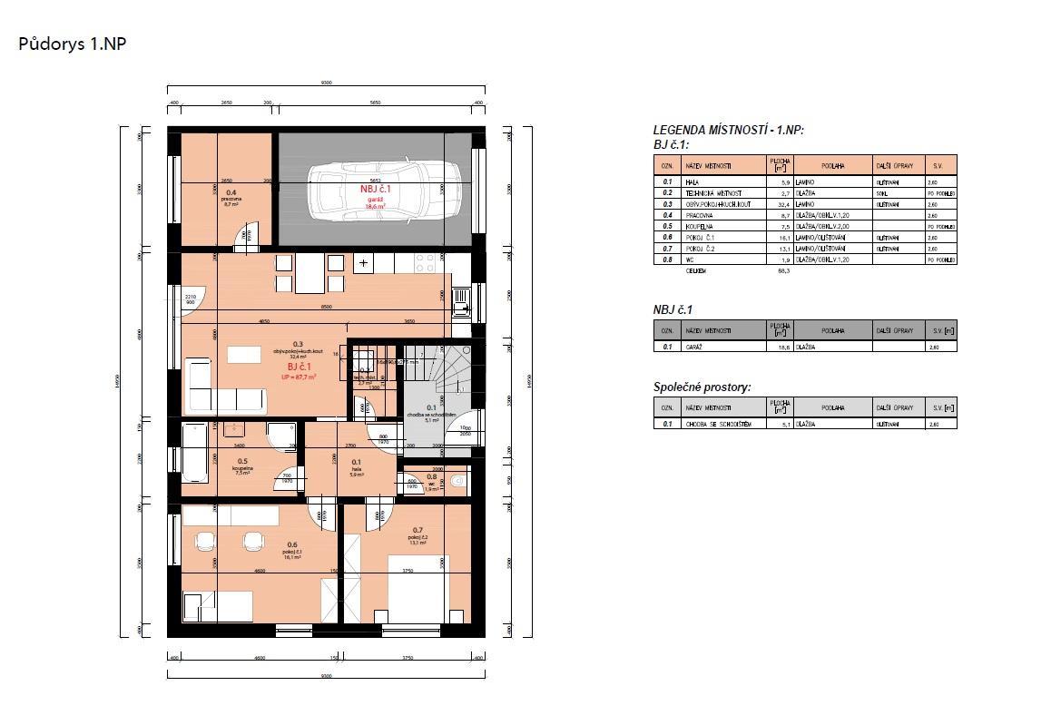 Nabízíme k prodeji novostavbu bytu o velikosti 3+kk + pracovna, šatna (technická místnost) o výměře 88,3 m2, který je součástí moderní novostavby domu se třemi bytovými jednotkami v obci Pravlov. Byt se nachází v 1.NP . Možnost pronájmu zahrady u bytu cca 100 m2 s následným možným odkupem. Dále možnost dokoupit parkovací stání u domu, klimatizaci, venkovní žaluzie. Možnost pronájmu garáže v domě. Standardy bytu, které jsou součástí ceny bytu: - podlahy - lamino/vinyl clic, keramická dlažba (možnost klientské změny) - sanitární technika - vybavení koupelny, WC - vč. montáže - interierové dveře + obložkové zárubně - okna plastová, 5-ti komorová, trojsklo, vstupní dveře celoprosklenné - vytápění - tepelné čerpadlo - podlahové vytápění do systémových desek vč. rozdělovače, v koupelně i topné těleso - fotovoltaika - vzduchotechnika průduchy, rekuperace V ceně bytu je příprava na kuchyňskou linku (kuchyňská linka není v ceně bytu). Možnost koupě bytu bez dokončeného interiéru za cenu 5.492.000,-Kč včetně provize. Cena i včetně dokončeného interiéru činí 6.399.000,-Kč včetně provize. Více informací ohledně financování a vč. podkladů v RK. V případě financování hypotečním úvěrem - finanční poradce zajištěn. Energetická třída B. <a href="https://www.eurobydleni.cz/domy/rodinny-dum/breclav/obec-zajeci/pronajem/"><strong>Pronájem rodinného domu Zaječí</strong></a>