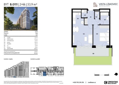 První etapa nového brněnského rezidenčního projektu Vista Lískovec je právě v prodeji! Nabízíme byt s oblíbenou dispozicí 2+kk o celkové výměře 54 m2, umístěný v přízemí. Součástí bytu je terasa o výměře 14 m2 a předzahrádka o výměře 15 m2 - ideální prostor pro relaxaci, pěstování bylinek i setkávání s přáteli. První etapa projektu nabídne celkem 260 promyšlených jednotek - od útulných 1+kk pro první bydlení až po rodinné 4+kk a prémiové mezonety v nejvyšších patrech. Většina bytů a ateliérů disponuje balkonem, přízemní jednotky nabízejí soukromé předzahrádky. Od devátého patra výše pak díky unikátnímu tvaru budovy vznikají prostorné terasy s dechberoucími výhledy na široké okolí a dostatkem místa pro trávení volného času. Jsou vybaveny integrovanými květníky, které zajišťují soukromí a nechybí ani praktický venkovní úložný prostor. V přízemí najdete komerční prostory pro služby, které zpříjemní život rezidentů. Samozřejmostí jsou garážová stání, sklepy, kolárna, myčka kol i uzavřený vnitroblok plný zeleně s dětským hřištěm a relaxačními zónami. Lokalita vás nezklame. Vista Lískovec se nachází v oblíbené části Brna - Starém Lískovci - jen pár kroků od zastávky šaliny Západní brána a v těsné blízkosti Jihlavské ulice. V pěší vzdálenosti máte školky, školy, nákupní centrum Campus Square, Fakultní nemocnici, kampus Masarykovy univerzity i sportovní areály. V okolí nechybí ani lesopark, přírodní rezervace Kamenný vrch nebo rozsáhlý park Bobrava. Plánované dokončení projektu je ve 4.Q roku 2028. Cena nezahrnuje garážové stání - jednotková cena garážového stání je od 700 000 Kč vč. DPH. Prodej probíhá přímo od developera. Pro více informací nás neváhejte kontaktovat.